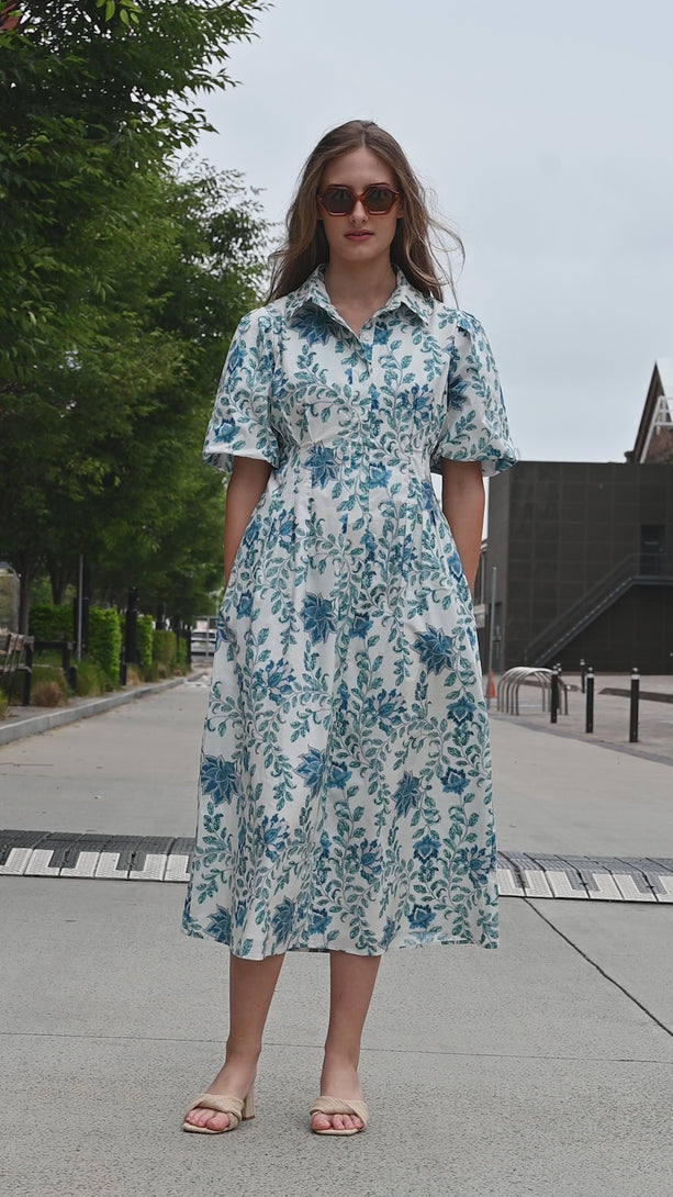 Our best selling Axel Dress now comes in this gorgeous Blue Botanica print exclusive to Wyatt Wylde. A timeless silhouette with modern ease, it features a flattering pleated waist, soft drape, and thoughtful detailing. Effortless to wear and perfect for any occasion.
